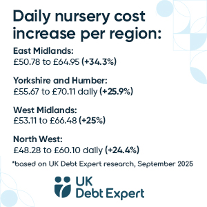 Perhaps the most alarming finding in our analysis is how dramatically childcare costs have risen. Since 2022, the average daily cost has jumped from £52 to £73 – a staggering 40% increase in just three years.
