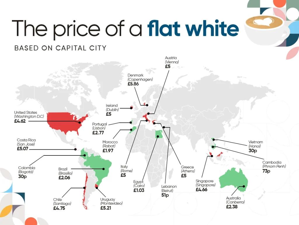 Despite the fact that the size of a flat white is almost always the same across the world, you could be paying above the odds depending on where you live (unless you’re willing to travel to Colombia).
